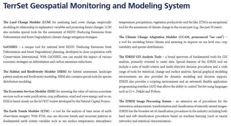 Land Change Modeler adalah perangkat lunak inovatif yang sepenuhnya terintegrasi ke dalam sistem TerrSet untuk mendukung pengambilan keputusan dalam perencanaan lahan / area. Dengan alur kerja otomatis yang ramah-pengguna, Land Change Modeler menyederhanakan kompleksitas analisis perubahan lahan. Land Change Modeler memungkinkan kita untuk menganalisis perubahan tutupan lahan dengan cepat, menghubungkan secara empiris Model dengan variabel penjelas, dan mensimulasikan skenario perubahan lahan di masa depan. The Land Change Modeler juga dapat digunakan untuk analisis khusus seperti penilaian REDD (Pengurangan Emisi dari Deforestasi dan Degradasi Hutan) serta mitigasi bencana dan strategi perubahan iklim.